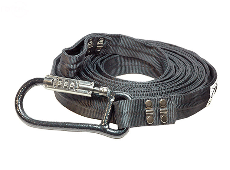 Lockstraps 24' Extension. A reliable tie-down and theft security in one neat package for securing your Garden Equipment, Powersports, ATVs, Marine, large tools, etc. One hardened-steel, combination-locking carabiners are at the end of an 24-foot soft extension strap that won't scratch your equipment, vehicle or trailer. Set your own combination and change it any time you want. All you need is a ballpoint pen. The strap is hardy against abrasion with an eight-stranded, braided, stainless steel cable inside the full length of the strap, and theft is further deterred with thickset galvanized-steel rivets that have a 1,200-lb. working load. CE Certified